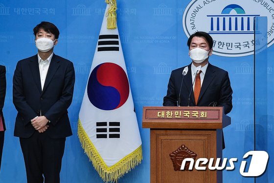 이준석 국민의힘 대표(왼쪽)와 안철수 국민의힘 의원. 사진은 지난 4월18일 서울 여의도 국회 소통관에서 국민의힘과의 합당을 선언하는 모습. (공동취재) 2022.4.18/뉴스1 © News1 유승관 기자