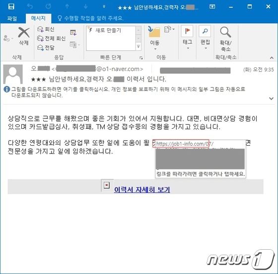 메일에는 실제 구인구직 사이트인 ‘잡인포'(jobinfo) 도메인을 모방한 ‘job1-info’ 도메인이 들어갔다.