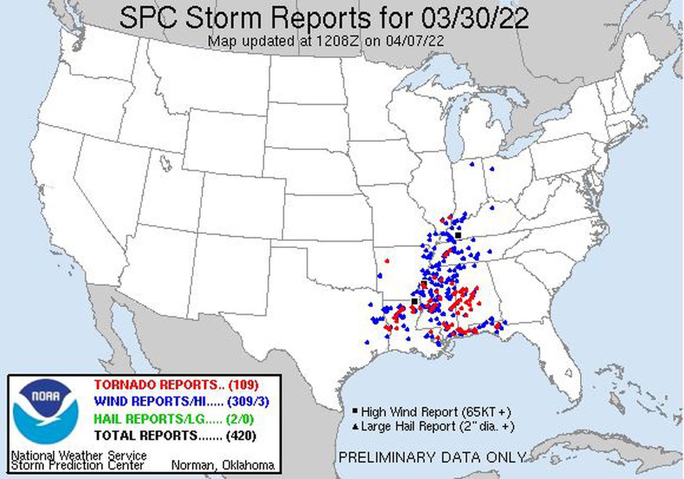 국립기상청에 따르면, 3월말 악천후로 인해 3월 30일 하루에만 딥 사우스의 8개 주에 걸쳐 무려 100건 이상의 토네이도 신고가 접수됐다고 밝혔다. 그 중 앨라배마에서 온 신고만 30건에 해당한다.