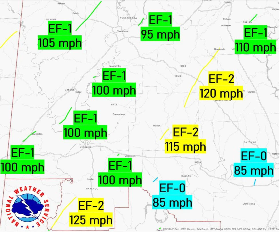 국립기상청은 토네이도가 얼마나 많이 왔는지 보고들을 조사한 결과, 4월 7일 현재 앨라배마 중부와 남부에서 15개 카운티에 걸쳐 21개의 토네이도를 확인했다고 밝혔다.