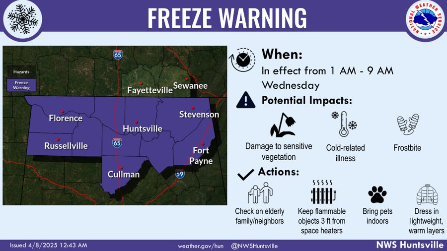 기상청은 오늘 밤 찬 공기가 주 전역에 자리 잡을 것이며, 오늘 밤 앨라배마 북부 일부 지역의 최저 기온은 20도까지 떨어질 수 있다며 저온에 발효될 동결 및 서리 경보와 주의보를 발령했다.