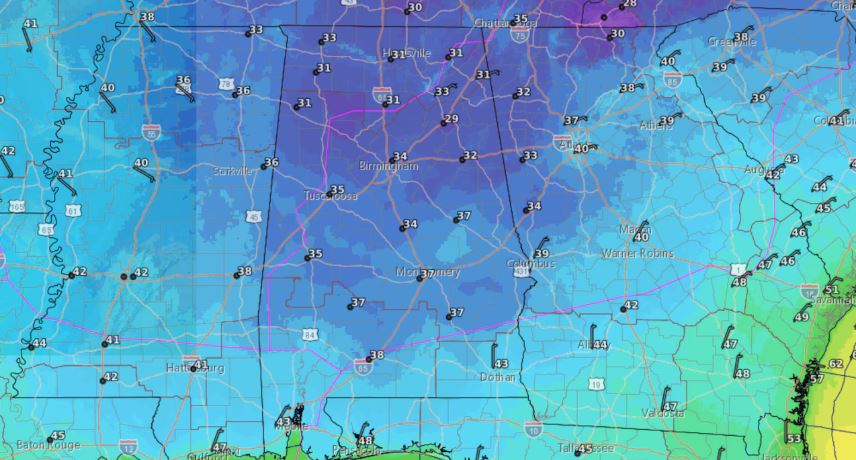 국립기상청은 오늘 밤 밤 북부 앨라배마의 기온이 20도 이상으로 떨어질 수 있으며, 중부와 남부 앨라배마 일부 지역에서도 30도 이하의 기온이 나타날 수 있다고 예상하고 있다.