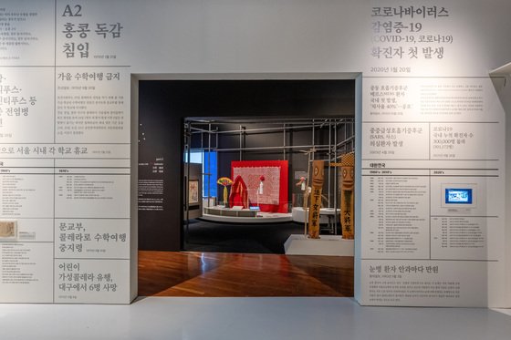 전시장은 부식된 철판 느낌의 구조물과 썩은 목판을 ‘역병으로 인해 무너진 사회와 일상’, 유물 앞뒤에 여러 형태로 교차한 비계를 ‘치료와 치유로 나아가는 사람들의 일상을 잇는 매개체’로 표현했다.