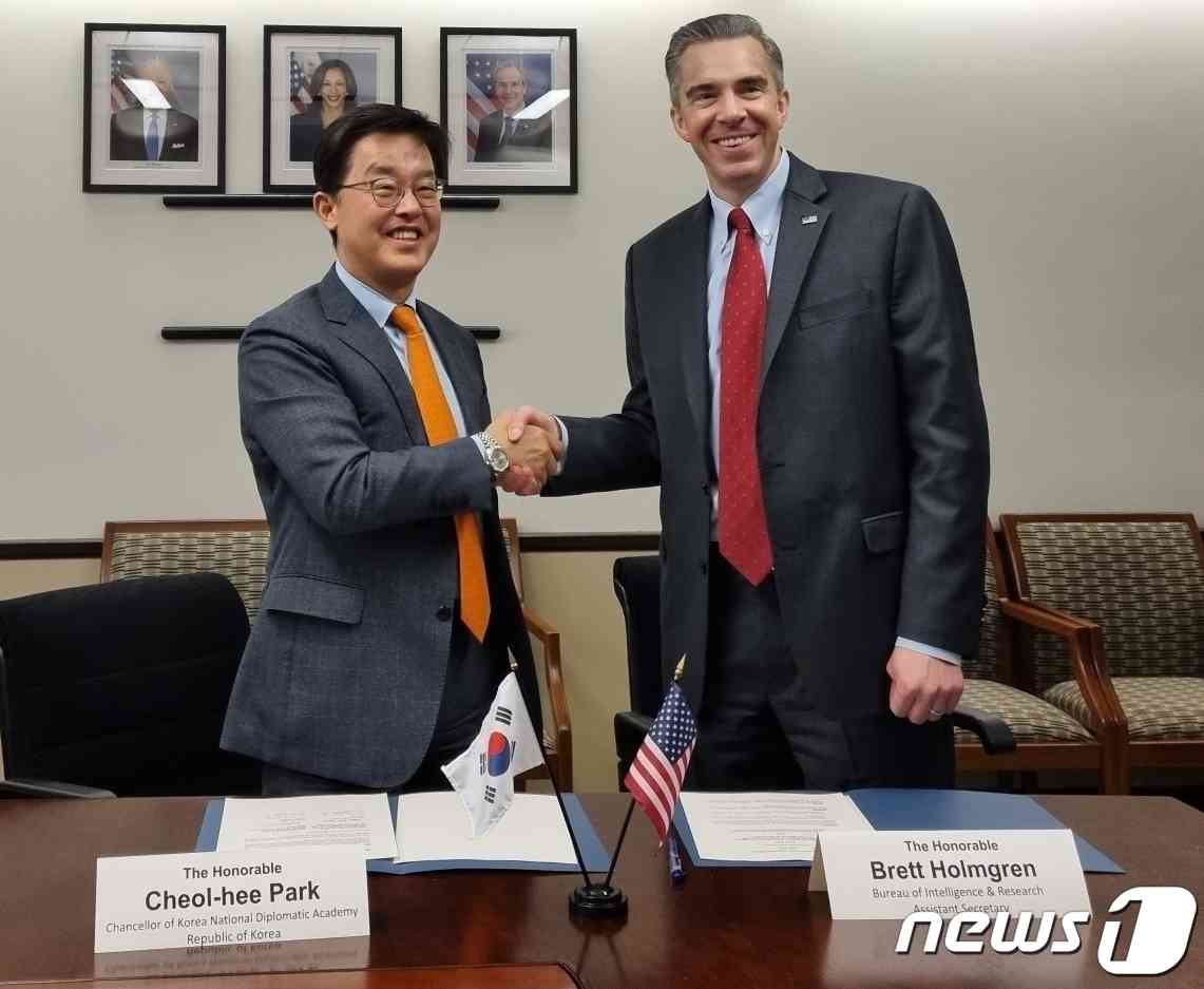 외교부에 따르면 박철희 국립외교원장과 브렛 홈그렌 미 국무부 정보조사국 차관보는 6일(현지시간) 이 같은 내용을 담은 두 기관 간의 ‘협력 제도화 양해각서(TOR)’에 서명했다.