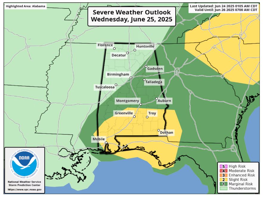 25일에는 2단계 위험 수준의 여름 폭풍이 앨라배마 남부 대부분 지역, 즉 모빌(Mobile), 도단(Dothan), 트로이(Troy), 그리고 그린빌(Greenville) 등에 산발적으로 발생할 가능성이 있다고 예보했다.