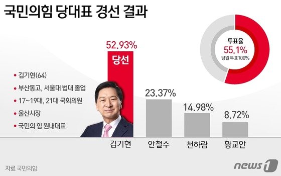 김 후보와 당권을 다툰 안철수, 천하람, 황교안 후보는 각각 23.37%(10만7803표), 14.98%(6만9122표), 8.72%(4만225표)를 득표했다.