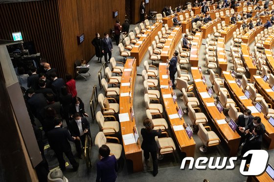 30일 서울 여의도 국회에서 열린 402회 국회(임시회) 제1차 본회의에서 양곡관리법 일부개정법률안(대안) 본회의 부의의 건에 대한 무기명 투표가 시작되자 국민의힘 의원들이 퇴장하고 있다. 이날 양곡관리법 개정안 본회의 부의의 건은 국민의힘 의원들의 표결 불참 속에 재석 의원 165인 중 찬성 157인, 반대 6인, 무효 2인으로 가결됐다. 2023.1.30/뉴스1 © News1 유승관 기자