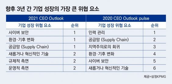 CEO들은 향후 3년 간 기업 성장의 가장 큰 위협 요소로 △사이버보안 리스크 △환경·기후변화 리스크 △공급망 리스크를 꼽았다.