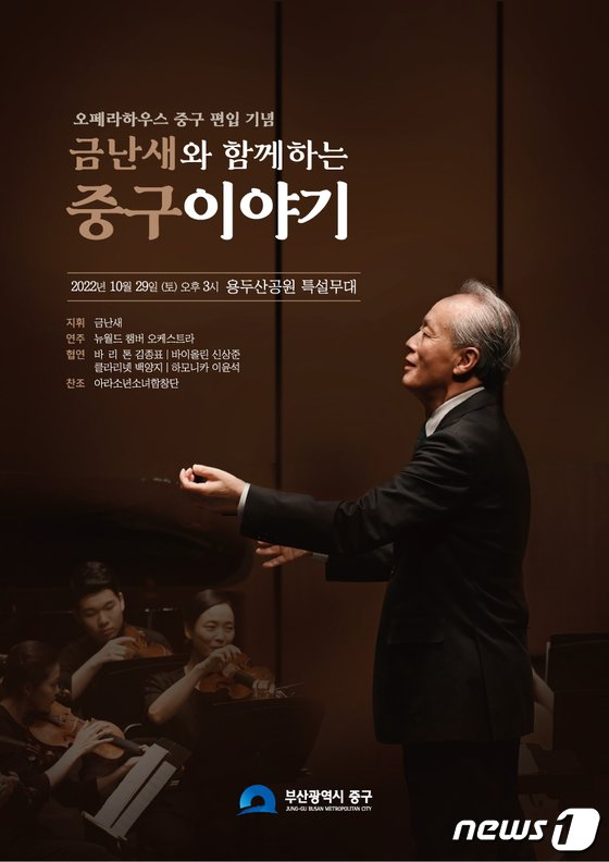 부산 중구는 ‘금난새와 함께하는 중구이야기’ 음악회를 오는 29일 중구 용두산공원 특설무대에서 연다고 6일 밝혔다. 이 음악회는 2024년 북항 재개발구역에 세계적인 음악명소로 건립될 오페라하우스의 중구 편입을 기념하기 위해 열린다.