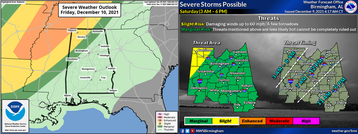 버밍험에 있는 국립기상청은 앨라배마 중부지역 전역은 토요일에 약간의 폭풍우를 볼 위험이 있다고 예측했다. 중부 앨라배마에서는 토요일 새벽 3시부터 오후 6시까지 폭풍우가 예상되며, 새벽 3시경 서부 앨라배마에서 시작된 폭풍은 오후 6시경 동부 앨라배마까지 이동할 것으로 보인다.