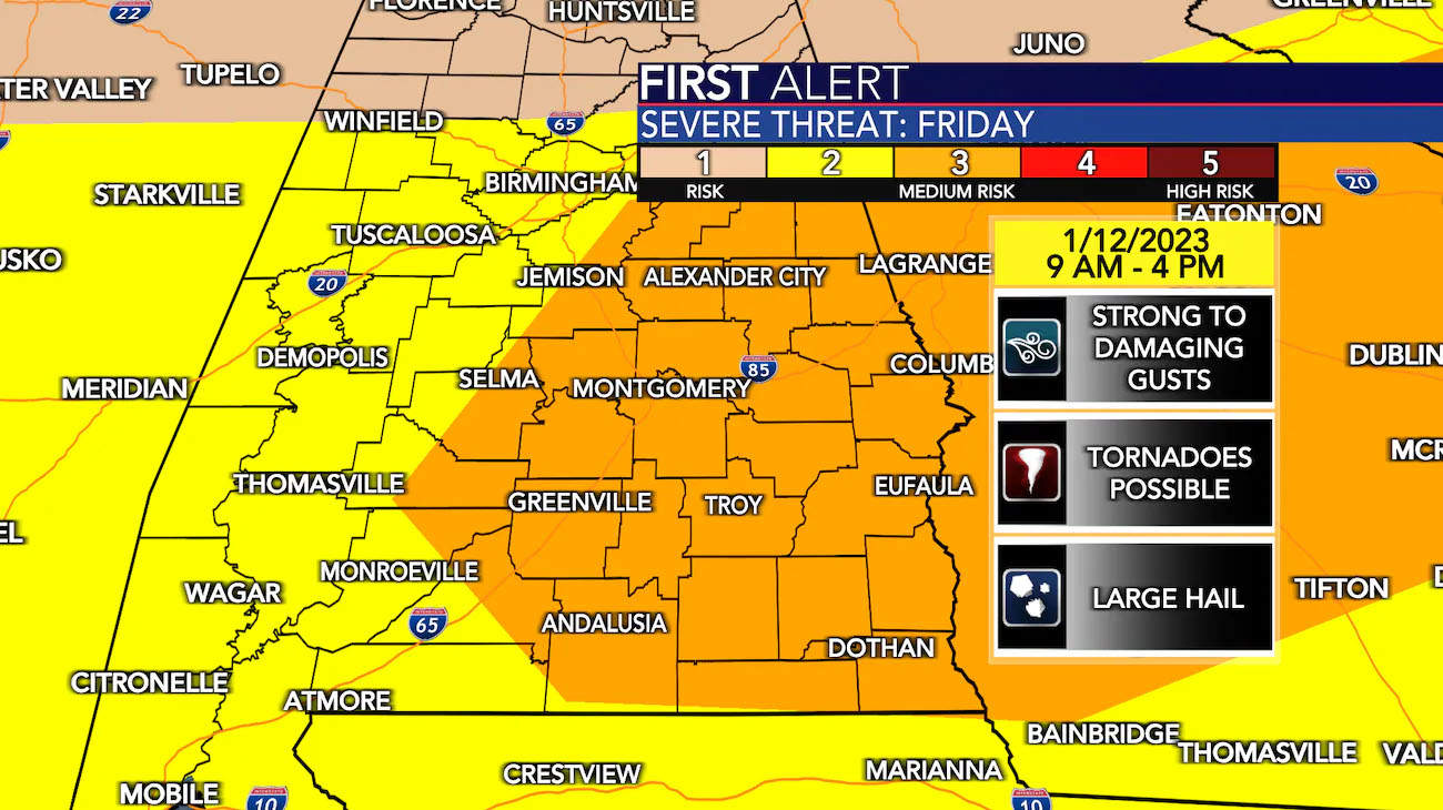 금요일(12일)에 산발적인 소나기와 뇌우를 동반하는 또 다른 강력한 고기압이 남부 지역을 휩쓸고 지나가면서 앨라배마주에 토네이도와 강풍 피해가 발생할 수 있다고 WSFA12 뉴스가 보도했다.
