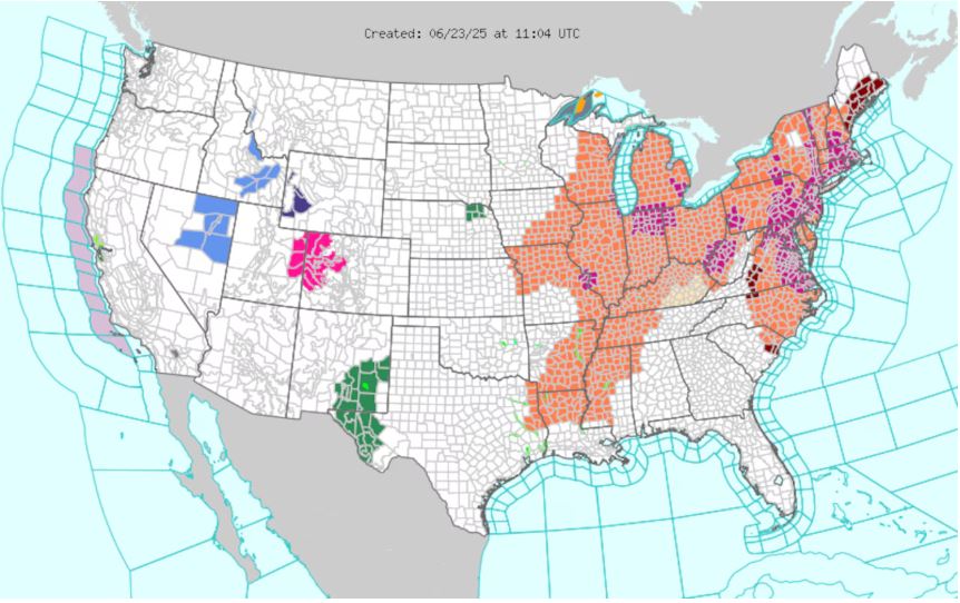 북부 앨라배마의 나머지 지역은 24일부터 폭염 주의보가 적용되며, 25일 오후 7시까지 이어질 예정이다. 버밍햄 기상청은 이 지역의 체감 온도가 최고 105도까지 상승할 수 있다고 밝혔다.