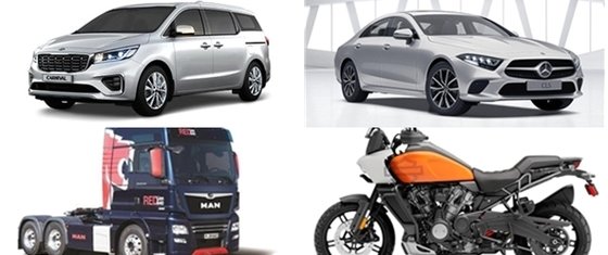 왼쪽 위부터 시계방향으로 기아 카니발, 벤츠 CLS 400 d 4MATIC, 할리데이비슨 팬아메리카, 만트럭 TGX 트랙터(국토교통부 제공) © 뉴스1