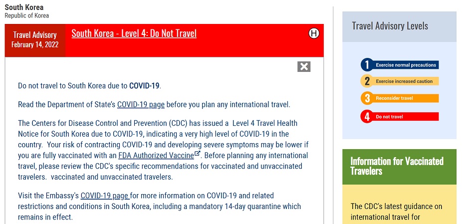 국무부는 웹사이트 공지에서 “이는 한국에서 매우 높은 수주의 코로나19를 나타낸다”며 “FDA 승인 백신을 완전히 접종하면 코로나19에 감염되도 심각한 증상이 발생할 위험이 낮아질 수 있다.”고 밝혔다.