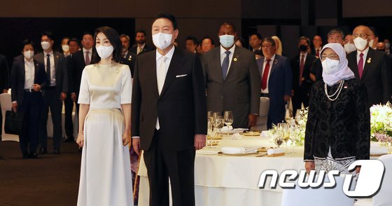 윤석열 대통령과 김건희 여사가 지난 10일 오후 서울 중구 신라호텔에서 열린 외빈 초청만찬에 참석하고 있다. (대통령실사진기자단) 2022.5.10/뉴스1 © News1 오대일 기자