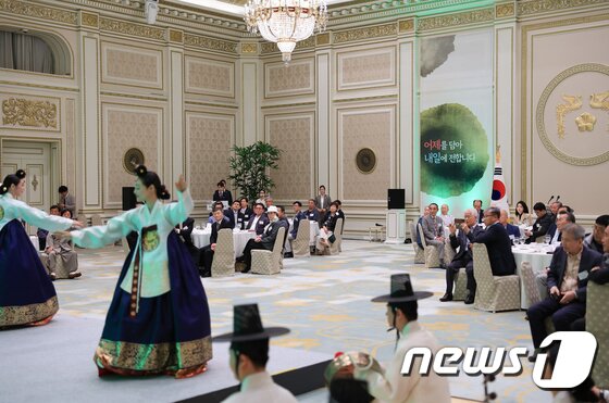 김건희 여사가 2일 청와대 영빈관에서 열린 국가무형문화재 보유단체 전승자 오찬에서 한국문화재재단 예술단의 전통춤 ‘태평무’ 공연을 관람하고 있다. (대통령실 제공) 2023.5.2/뉴스1 © News1 오대일 기자