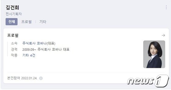 김씨는 지난 24일 네이버에 자신의 프로필을 개설하면서 사실상 ‘등판 예고’를 했다. 김씨는 프로필에 자신을 ‘전시기획자’로 소개하고 현재 소속을 주식회사 코바나 대표로 적었다. 2015년부터 5년간 기획한 전시 목록 4건도 첨부했다. 그는 최근 한 스튜디오에서 직접 프로필 사진 여러 장 촬영한 것으로 알려졌다.