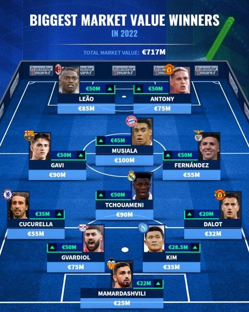 독일의 축구통계 전문인 ‘트랜스퍼마크트’는 28일(한국시간) 2022년 한 해 동안 몸값이 치솟은 선수들을 포지션별로 정리했다.