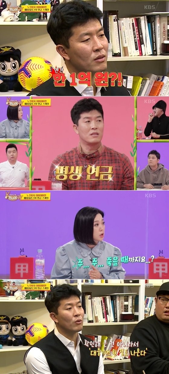 김병현은 “정확하게는 모르는데 연간 한 1억원이 죽을 때까지 나온다. 그리고 자식들한테도 간다고 이야기를 들었다”라고 얘기해줬다.
