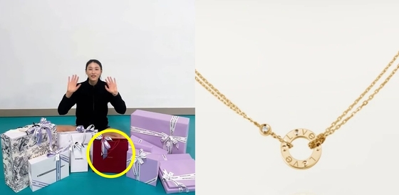‘김연경 갤러리’로부터 생일 선물을 받고 감사 인사를 남긴 영상(왼쪽)과 선물 받은 목걸이 / (김연경 갤러리 유튜브, 까르띠에 홈페이지 갈무리) © 뉴스1