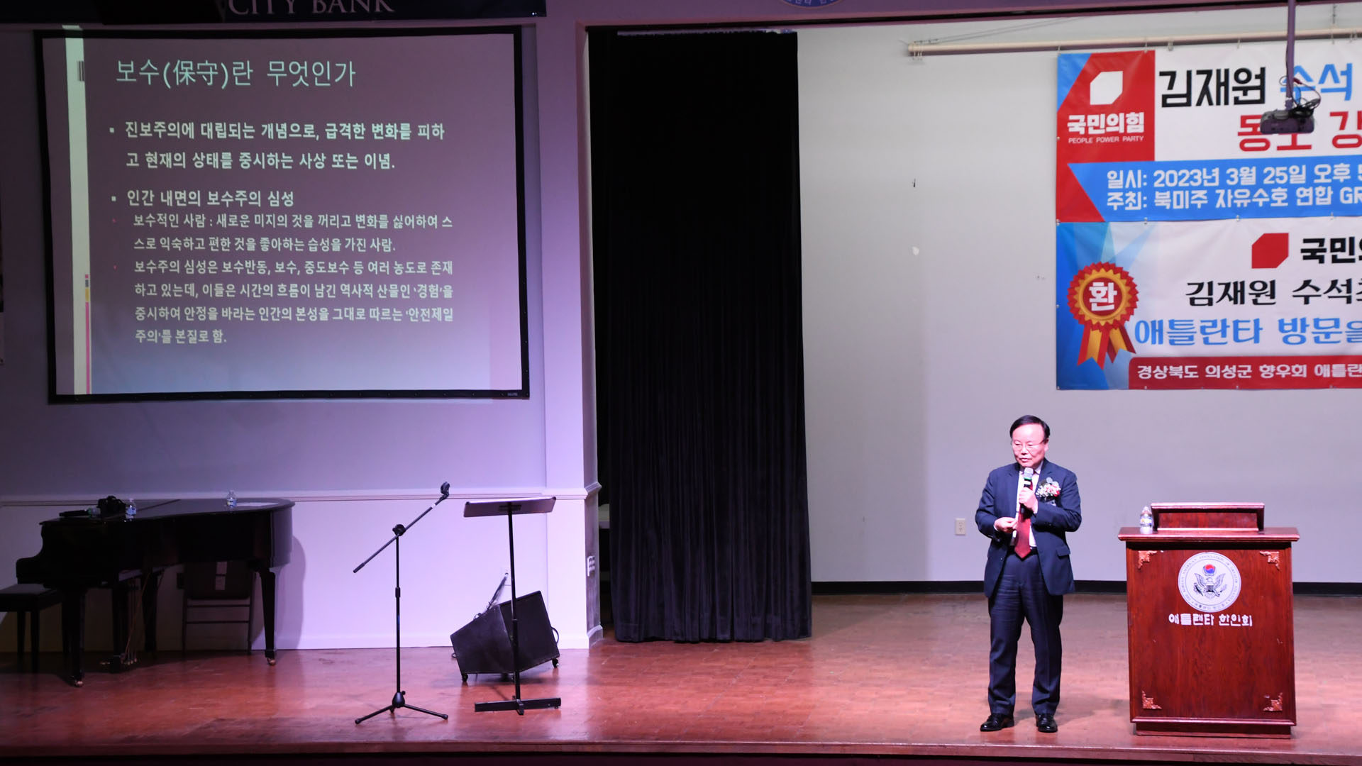 김재원 국민의힘 수석최고위원은 한국이 보수정권으로 교체됐음에도 불구하고 한국 내에 끊임없는 사상 내전이 계속되고 있는 점에 대해 그람시(A Gramsci)의 “진지전”이 지속되고 있기 때문이라고 25일(토) 우파 재미동포단체가 주최한 행사에서 말했다.