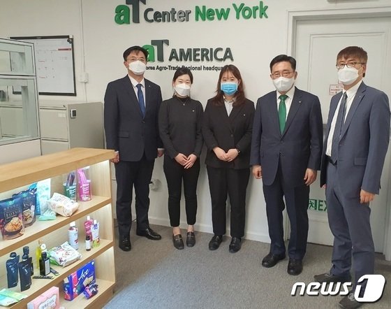한국농수산식품유통공사 김춘진 사장(오른쪽 두번째)이 15일(현지시간) 업무 점검 차 미국 뉴욕지사를 방문하고 있다.© 뉴스1