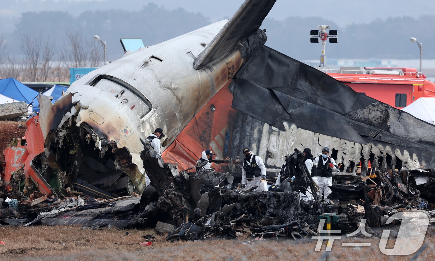 30일 오전 전남 무안국제공항에서 과학수사 경찰들이 전날 발생한 제주항공 여객기 충돌 폭발 사고 잔해를 수색하고 있다. 2024.12.30/뉴스1 ⓒ News1 김성진 기자