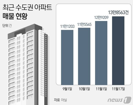 18일 부동산 빅데이터 업체 아실에 따르면 17일 기준 수도권 아파트 매물은 13만8563건이다. 지역별로 서울 4만4790건, 인천 1만6267건, 경기 7만7506건이다.