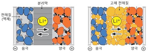 | 리튬이온 배터리(좌)와 전고체 배터리(우)의 구조(삼성SDI 제공) © 뉴스1 |