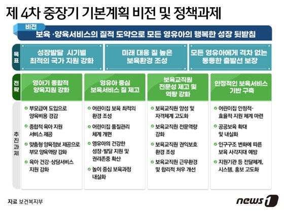복지부는 중장기적 방향에 따라 보육정책을 원활하게 추진하기 위해 중장기 보육 기본계획을 5년마다 수립·시행 중이다. 정부는 이번 4차 기본계획의 목표를 △영유아 성장발달 시기별 최적의 국가 지원 강화 △미래 대응 질 높은 보육 환경 조성 △모든 영유아에게 격차 없는 평등한 출발선 보장 등 크게 3가지로 설정했다.