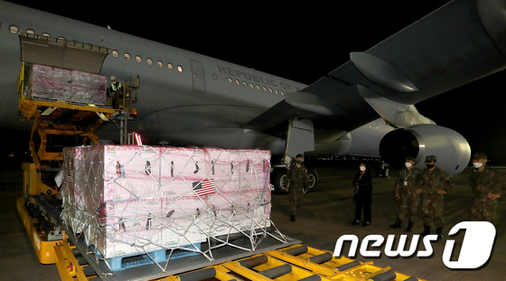 | 미국 행정부가 한국군에 제공한 얀센 백신 100만 명 분을 실은 공군 다목적 공중급유수송기 ‘KC-330’이 5일 새벽 경기도 성남 서울공항에 도착해 군 관계자들이 백신을 수송하고 있다. 얀센 백신은 주로 한국군과 유관 종사자에게 접종하게 되며 긴급 출국이 필요한 인력이나 의사가 없는 도서지역 주민에게도 투여될 예정이다.(국방일보 제공) 2021.6.5/뉴스1 © News1 |