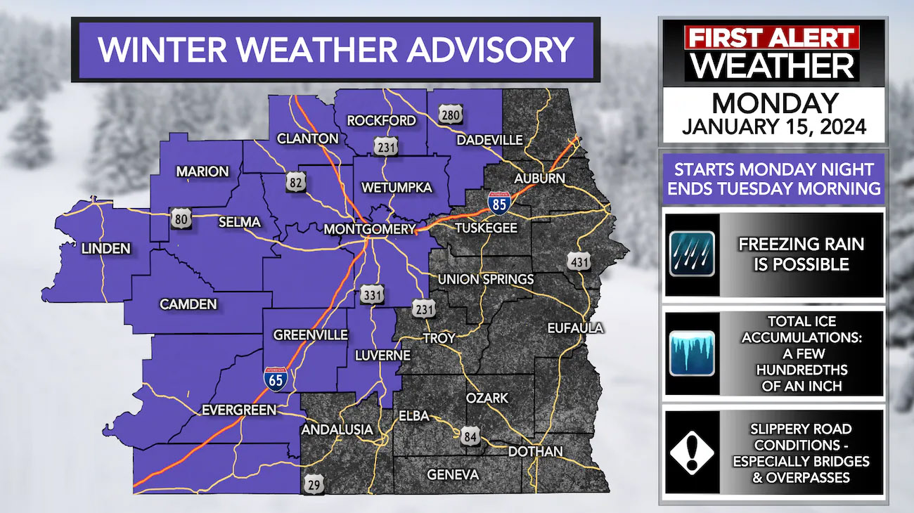 겨울 기상주의보는 월요일 오후 6시부터 화요일 오전 9시까지 지속될 예정이다. 이 주의보가 적용되는 카운티는 댈러스, 마렝고, 페리, 칠튼, 먼호, 윌콕스 등이다. 이로 인해 도로가 미끄러워지고 교량과 고가도로가 결빙될 수 있으며, 월요일부터 화요일까지 밤새도록 각별한 주의가 요구된다.