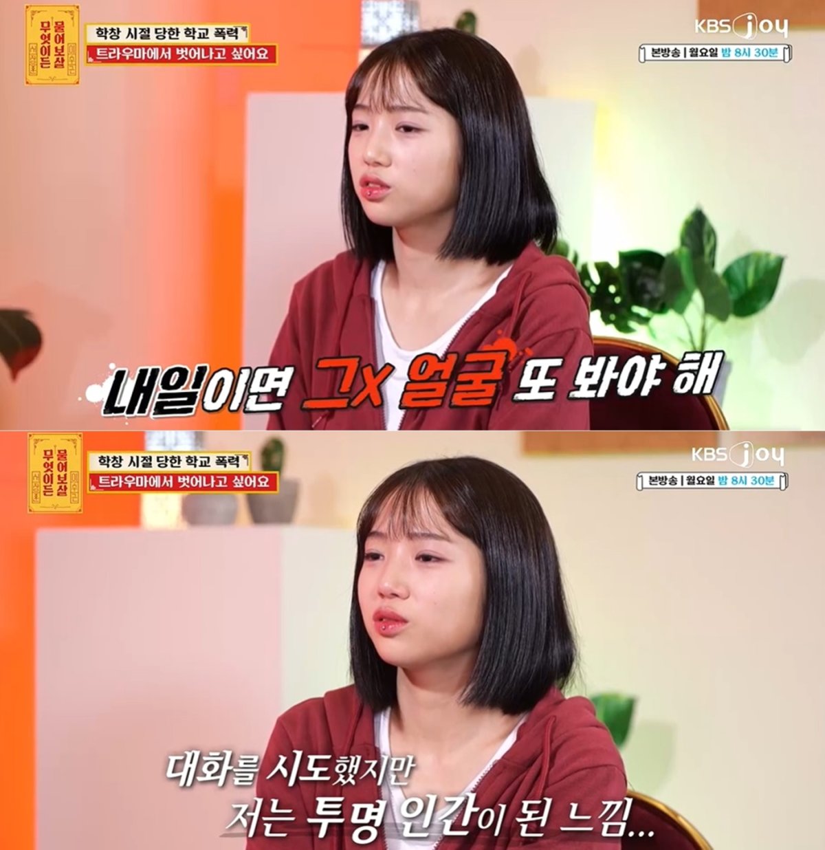 4일 KBS Joy에서 방송된 ‘무엇이든 물어보살’에는 성인이 됐음에도 학창 시절에 당한 학교 폭력 트라우마에서 벗어나지 못해 괴로워하는 사연자가 출연했다.