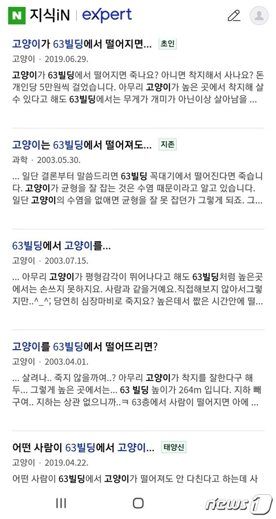 주요 포털사이트에 올라온 고양이 관련 질문. 63빌딩에서 떨어져도 사느냐는 질문이 꽤 있다.(포털사이트 갈무리) © 뉴스1