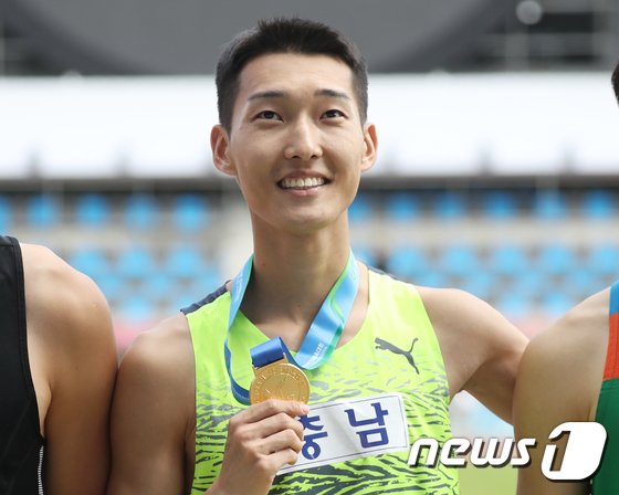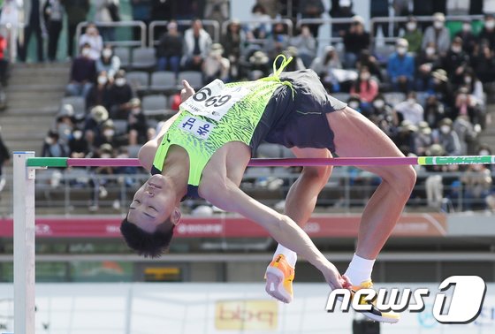 우상혁은 12일 울산종합운동장에서 열린 제103회 전국체육대회 육상 남자 일반부 높이뛰기 결선에서 2m15를 넘어 정상에 올랐다.