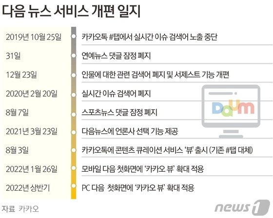 이후 연예 뉴스 댓글 폐지, 실시간 이슈 검색어 폐지, 스포츠뉴스 댓글 폐지에 이어 지난해 8월 ‘카카오 뷰’를 카카오톡을 통해 출시, 모바일 다음 서비스 개편 작업을 진행해왔다. PC 다음 뉴스 서비스 역시 올해 상반기 중 개편될 예정이다.