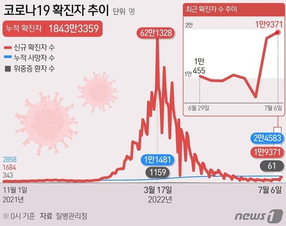 7일 중앙방역대책본부에 따르면 전날 신규 확진자는 1만9371명으로 1주일 전인 지난달 29일(1만455명)보다 84.8%(8916명) 증가했다. 5월 25일 2만3945명 이후 42일(6주일) 만에 가장 큰 규모로 발생했다. 재유행이 이미 시작됐거나 임박했다는 관측이 짙어지고 있다.