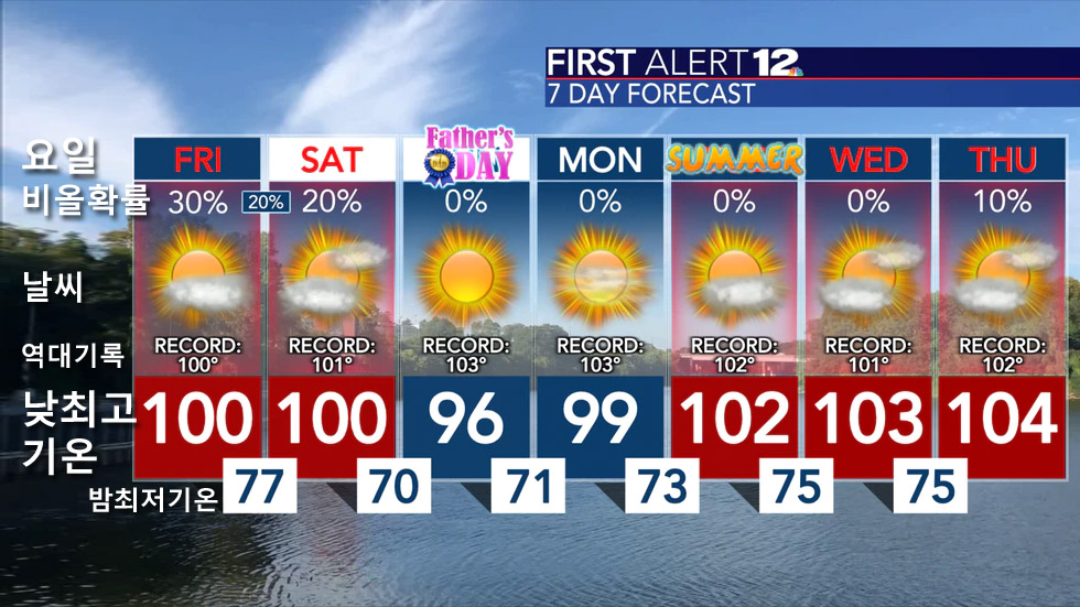 오늘과 내일은 매우 높은 습도가 예상되면서 최고기온 지수(체감온도)는 위험할 정도로 높을 것으로 보여 주의가 요구된다. 오늘은 종일, 내일은 대부분 지역에서 103~110도 안팎의 기온이 느껴지겠다. 그 후 토요일 오후에는 습도가 많이 떨어지겠지만 다음 주 초까지 무더위는 계속될 것이다.