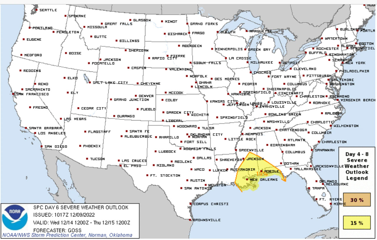 NOAA의 폭풍예측센터는 다음 주 수요일(14일) 앨라배마 남서부에 심한 폭풍 위험이 있다고 밝혔다.