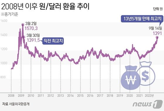 코스피는 전일 대비 1.56% 하락 마감했으며 달러·원 환율은 장중 1395원을 넘으며 1400원을 목전에 두게 됐다. 글로벌 금융위기 한창이던 2009년 3월 이후 13년5개월 만이다.