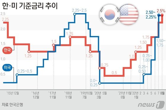 현재 우리나라 기준금리는 2.50%로 미국의 기준금리 상단과 같다. 그러나 미국이 일주일 앞으로 다가온 9월 FOMC 회의에서 자이언트 스텝을 택하면 한·미 기준금리는 곧바로 역전된다.