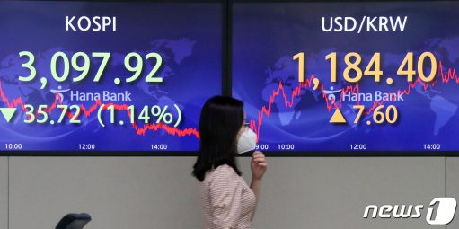 28일 오후 서울 중구 하나은행 명동점 딜링룸 전광판의 코스피 지수가 전일 대비 35.72포인트(1.14%) 내린 3097.92를 나타내고 있다. 이날 코스닥 지수는 22.31포인트(2.16%) 내린 1012.51를 기록했고, 원·달러 환율은 7.6원 오른 1184.4원에 장을 마쳤다. 2021.9.28/뉴스1 © News1