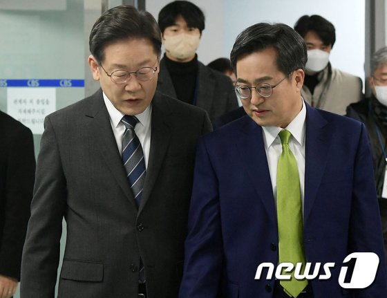 이재명 더불어민주당 대선 후보와 김동연 새로운물결 대선 후보가 2일 서울 양천구 CBS사옥에서 열린 양자 정책토론을 위해 스튜디오로 이동하며 대화를 나누고 있다. 이날 토론은 20대 대선 후보간 성사된 첫 양자토론으로, 경제·정치·외교안보 3개 분야를 주제로 진행된다. 2022.2.2/뉴스1 © News1 국회사진취재단