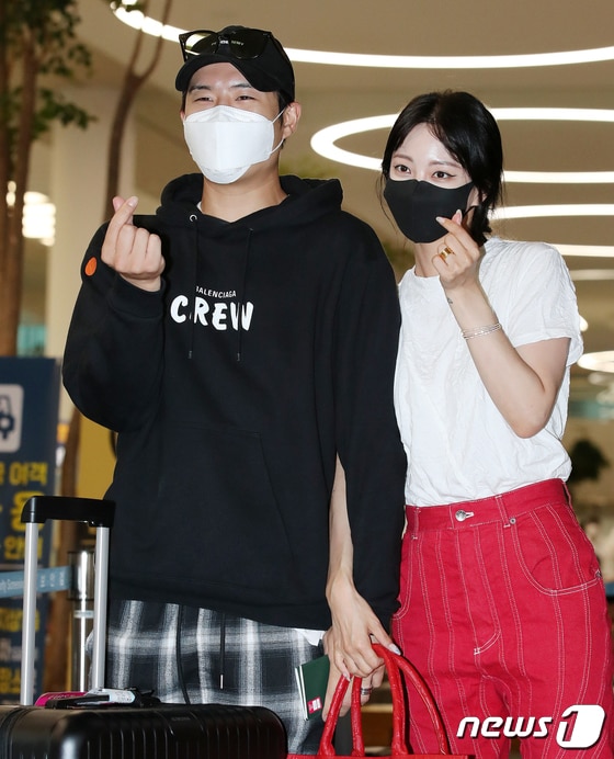 | 배우 한예슬이 9일 오후 개인 일정을 소화 후 남자친구 A씨와 함께 인천국제공항 제2터미널을통해 귀국하고 있다. 2021.8.9/뉴스1 © News1 김진환 기자 |