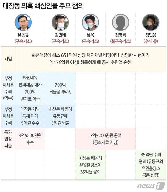 검찰은 이들과 유 전 본부장이 성남도시개발공사 전략사업실장을 지낸 정민용 변호사 등과 공모해 화천대유 및 그 관계사 천화동인 1∼7호에 최소 651억원 상당의 택지개발 배당 이익과 최소 1176억원 상당의 시행 이익을 몰아주고 그만큼 공사에 손해를 끼쳤다고 보고 있다.