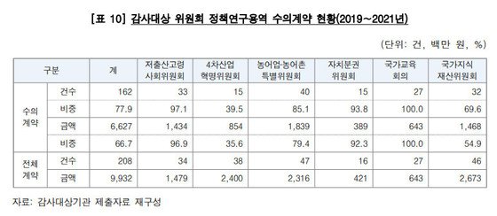 한편 정책연구용역비와 관련해 6개 위원회 가운데 4차산업위만 제외하고 나머지 5개 위원회가 전체 정책연구용역 과제 중 수의계약 비중이 과반을 차지했다.