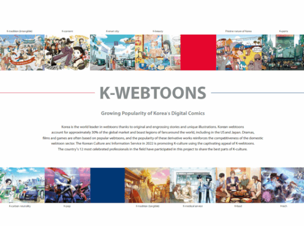 작가들은 대한민국의 대표적인 이미지인 한국 전통문화, 독창적인 콘텐츠, 사계절, 스포츠, 케이팝, 의료, 한식, 정보통신기술 등을 웹툰으로 담아냈다.
