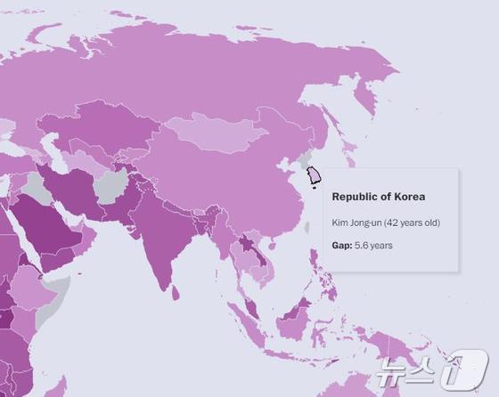 WP는 그러면서 ‘2024년 지도자와 해당 국가의 인구 간 연령 격차’에 대한 지도 그래픽을 첨부했는데, 여기서 분홍색으로 색칠된 부분에 마우스 커서 등을 대면 해당 나라명과 지도자명, 지도자의 나이, 연령 격차가 함께 표기된다.
