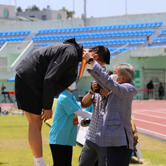 임대기 회장은 이날 예천공설운동장에서 열리고 있는 제50회 KBS배전국육상경기대회 현장에서 우상혁에게 순금메달을 전달했다.