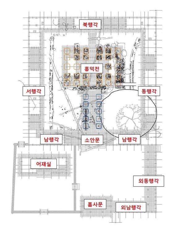 궁능유적본부는 2013년부터 2016년까지 발굴조사를 진행한 결과와 각종 사진·문헌 등을 토대로 흥덕전과 전각 앞의 복도각, 이를 둘러싼 행각과 삼문, 별도의 담장으로 구획된 어재실 등 각 건물의 배치 특성과 형태를 파악했다.